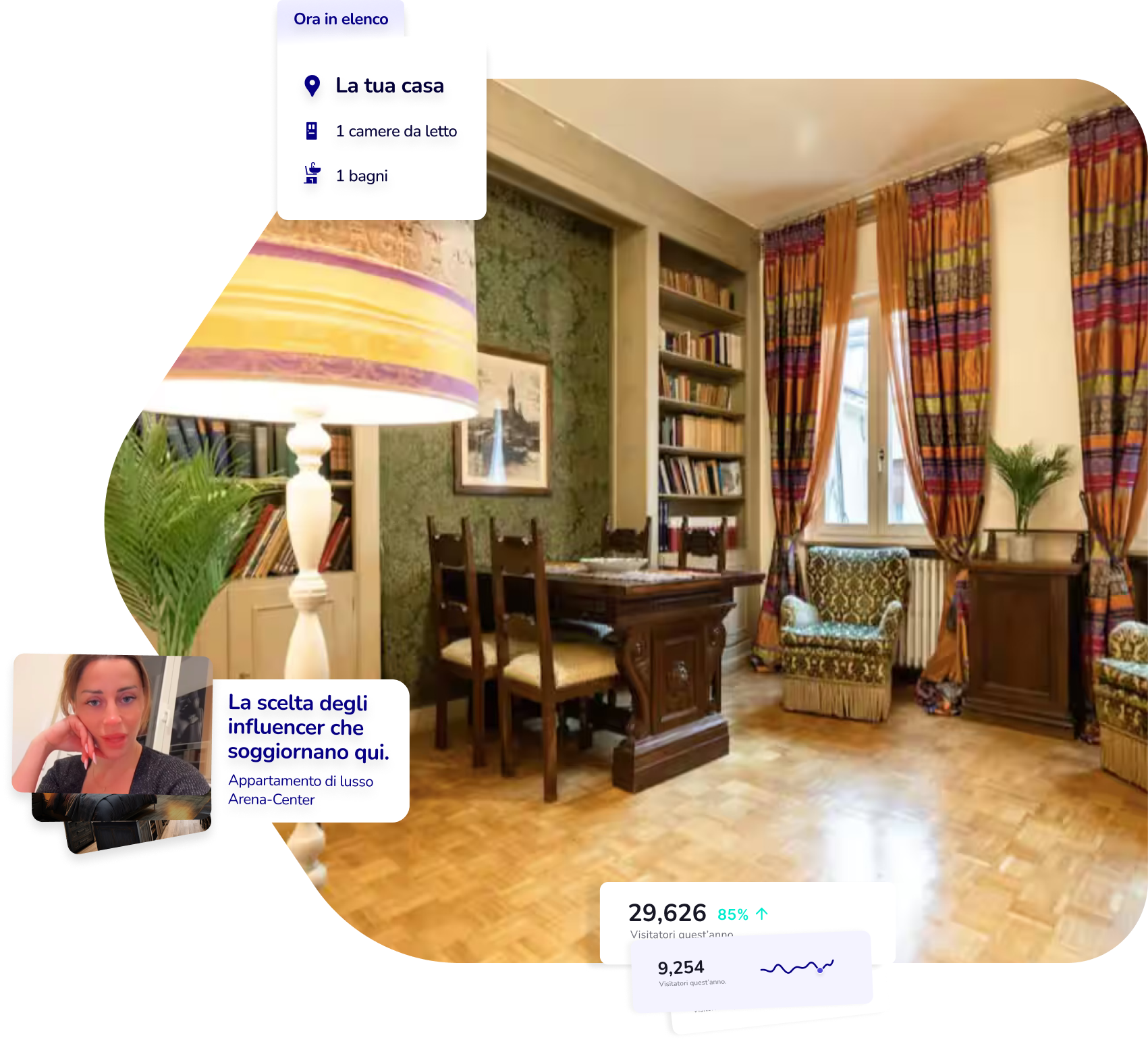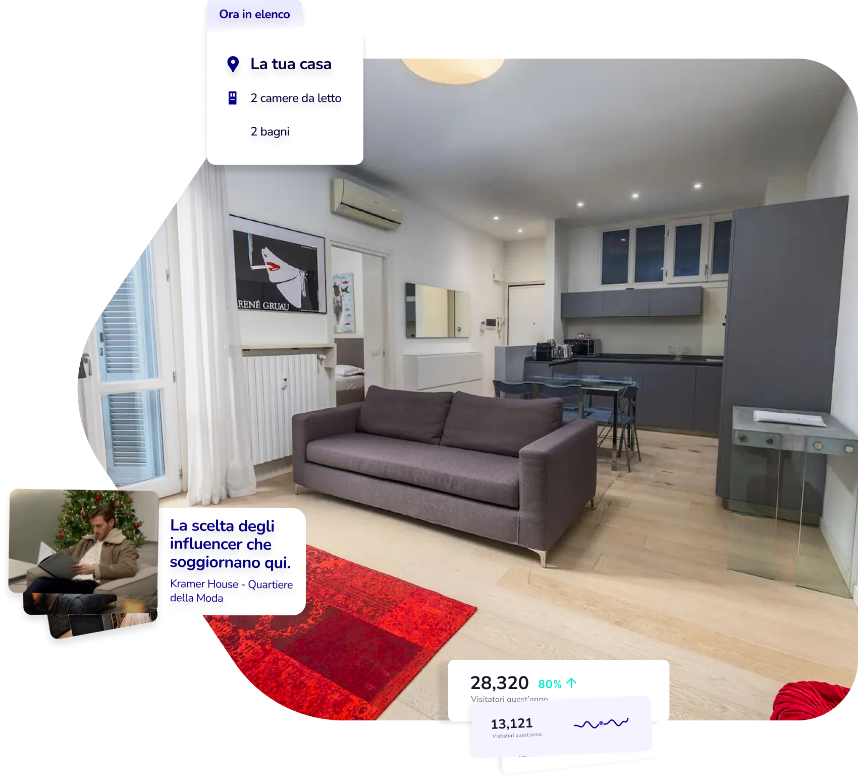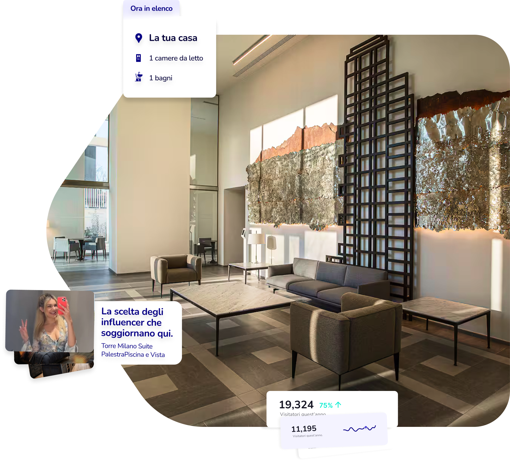 selezioniamo influencer in linea con il tuo immobile per promuovere le tue proprietà, portando prenotazioni dirette e traffico qualificato. Questo riduce le commissioni delle OTA, aumentando il guadagno medio per i proprietari (fino al 18% in più).